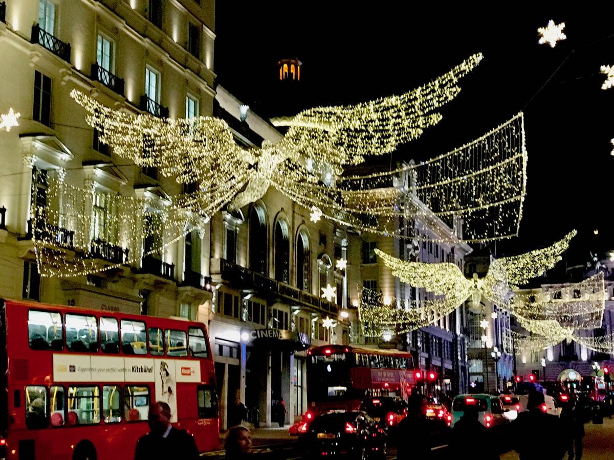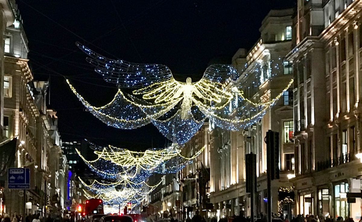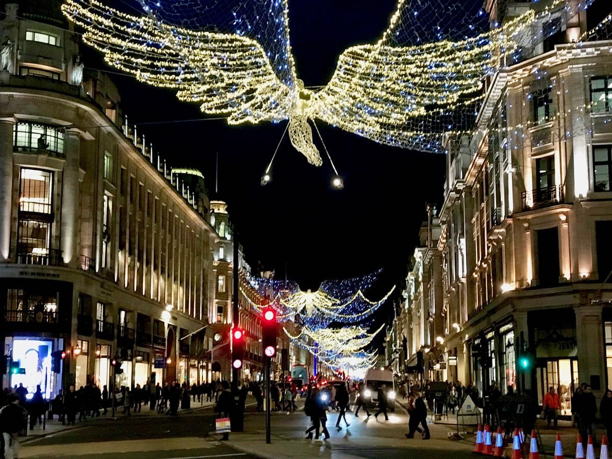 We stay for half an hour enjoying the ambience and people watching followed by the use of their facilities and then we’re off again. It’s very nearly dark as we leave and our attention is drawn to the huge effigies depicted by the lights on Regents Street. They stand out like Christmas angels flying around the curve of buildings that guides the constant flow of traffic onto Piccadilly. As we walk around the outside of the sweeping crescent, Regent Street enhances the view by helpfully becoming straight and we can see the decorations nearly as far as Oxford Circus.