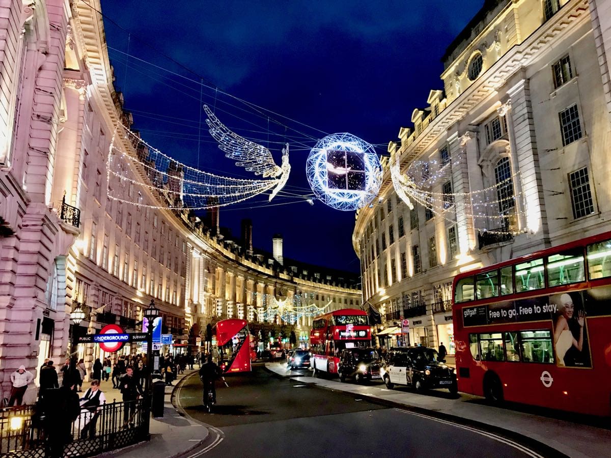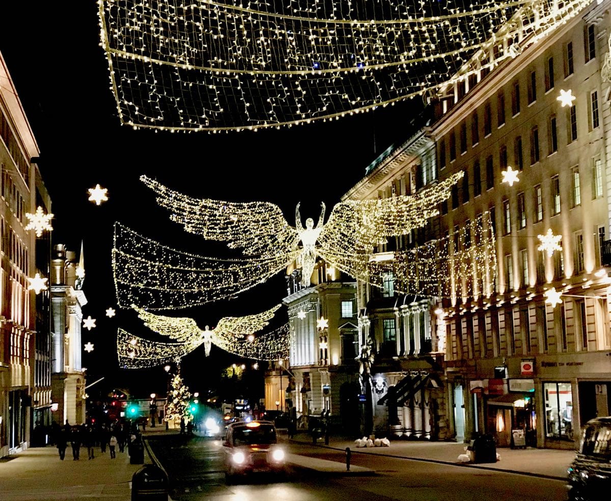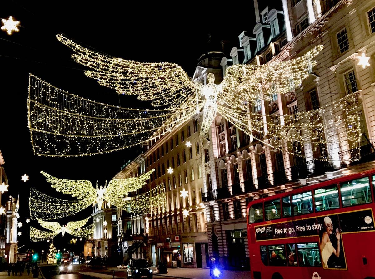 We stay for half an hour enjoying the ambience and people watching followed by the use of their facilities and then we’re off again. It’s very nearly dark as we leave and our attention is drawn to the huge effigies depicted by the lights on Regents Street. They stand out like Christmas angels flying around the curve of buildings that guides the constant flow of traffic onto Piccadilly. As we walk around the outside of the sweeping crescent, Regent Street enhances the view by helpfully becoming straight and we can see the decorations nearly as far as Oxford Circus.