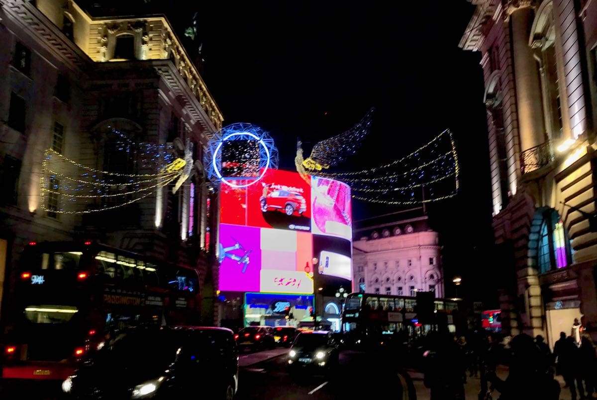 The daylight is beginning to fade as we make our way out of the square towards Regents Street where the advertising hoardings are impressively bright following several months of refurbishment.