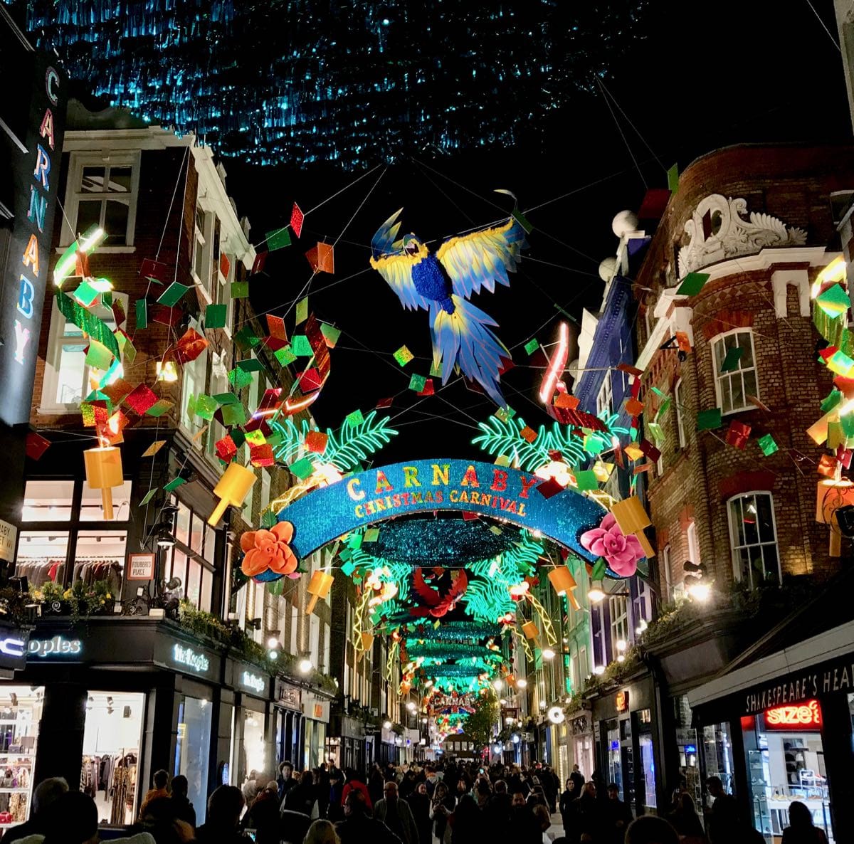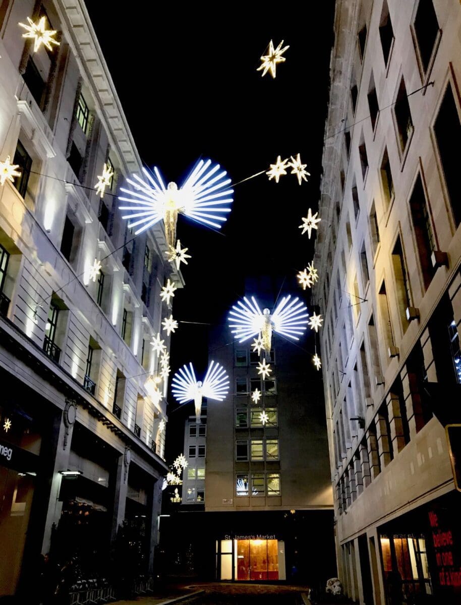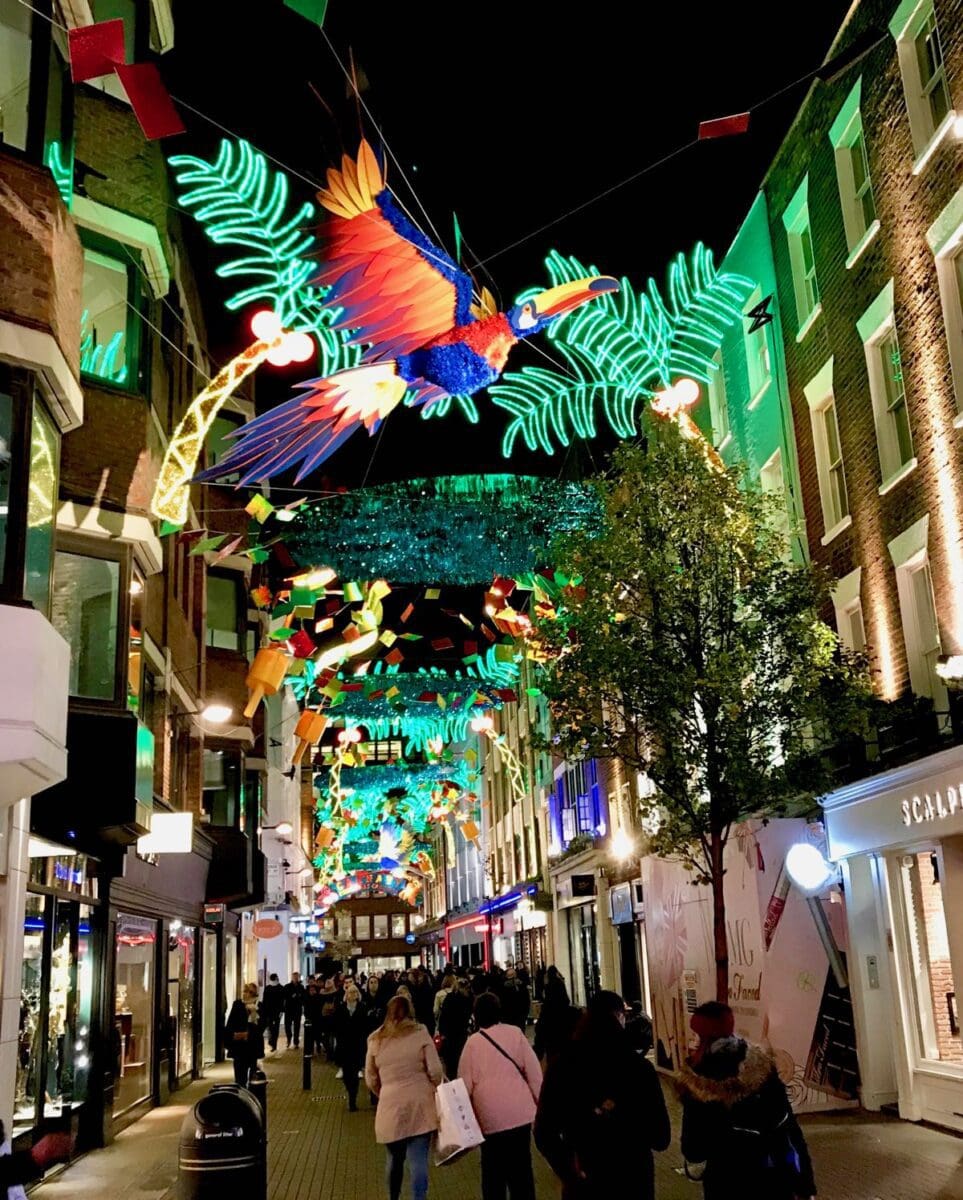 Our target is Tenison Court which is a small alleyway through to Kingly Street cutting through Ganton Street to our target, Carnaby Street. Even though they’re slightly off the main thoroughfare, each of these linking streets have made an effort with lights themed around either winter or the Christmas story then we round the corner into Carnaby Street and it’s astonishing.