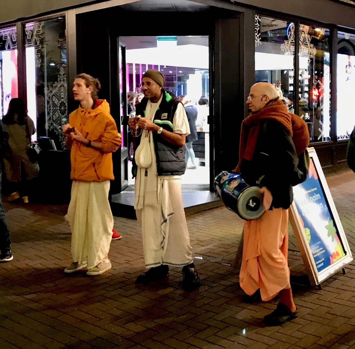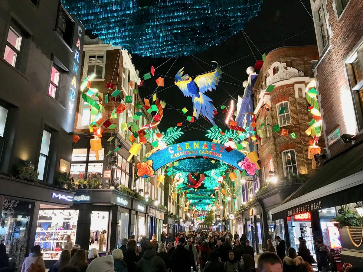 The lights on Carnaby Street are Caribean themed with palm trees, parrots and other exotic plants and animals. It’s so different that it shouldn’t work but it certainly does. There’s the usual Hare Krishna people with smiles that add even more light to the already flood lit street. They’re beating drums, chanting and dancing in a slow and easy lope adding atmosphere to the atmosphere, this is great. We walk the full length of this iconic street and whilst it’s nothing like its early incarnation in the 1960’s, it’s still a great place to be on a comfortable winter evening pre-Christmas.