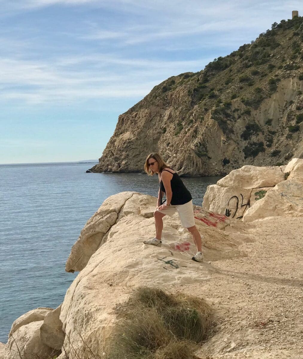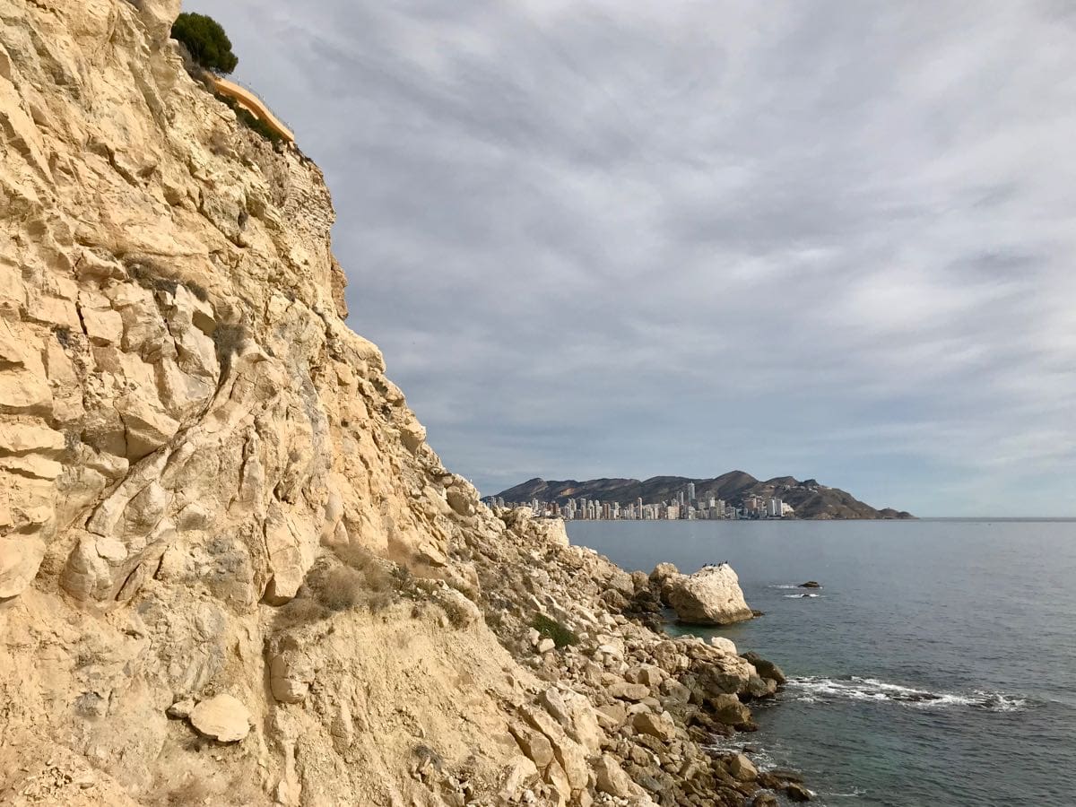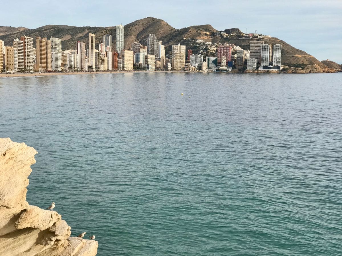 The bus drops us in a tiny bay which is worth a visit purely because it is slightly forgotten and has a ‘relatively’ quiet ambiance where there appear to be a number of discerning Dutch and German people. The beach is adjacent to Cala Finestrat, Cala is a Spanish word for river or cove and Finestrat is a district. We walk around the tiny cove and up on to the rock which is bathed in sunshine. It’s a dead-end but no matter, we’re in no hurry and this new view of Benidorm is interesting for its own sake. There’s a young man walking towards us who smiles and wishes “Hasta luego” (see you later). It’s the equivalent of “So long” in English and is meaningless in content but a wonderful illustration of how friendly the Spanish people are; always a “Hola” or “Buenas días” and usually delivered with a smile – sunshine brings out the best in everyone.