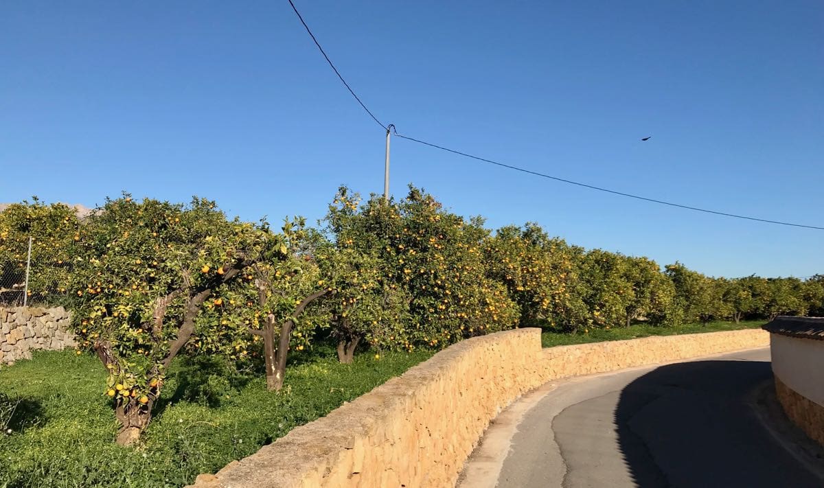 There are wire mesh fences separating the lane from the groves often with a small wall and always with a warning of video surveillance. As we reach to top of one of the gentle hills there are some overhanging oranges and we’re tempted as Mike once told us in France that it was acceptable to scavenge but only for personal consumption and not for gain – so, encouraged by the Pilgrim, I pinch one…