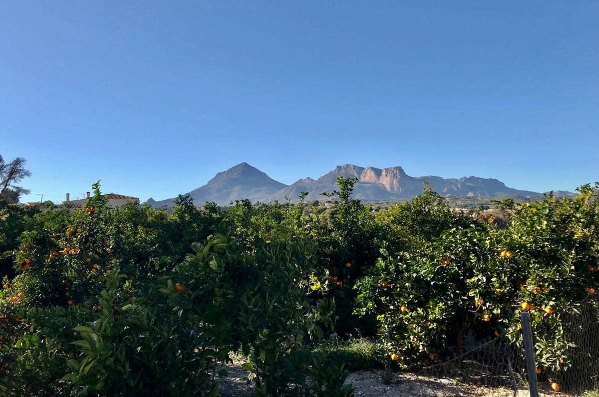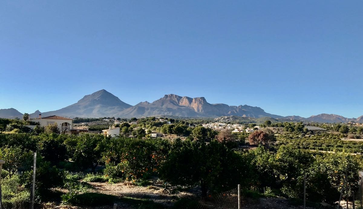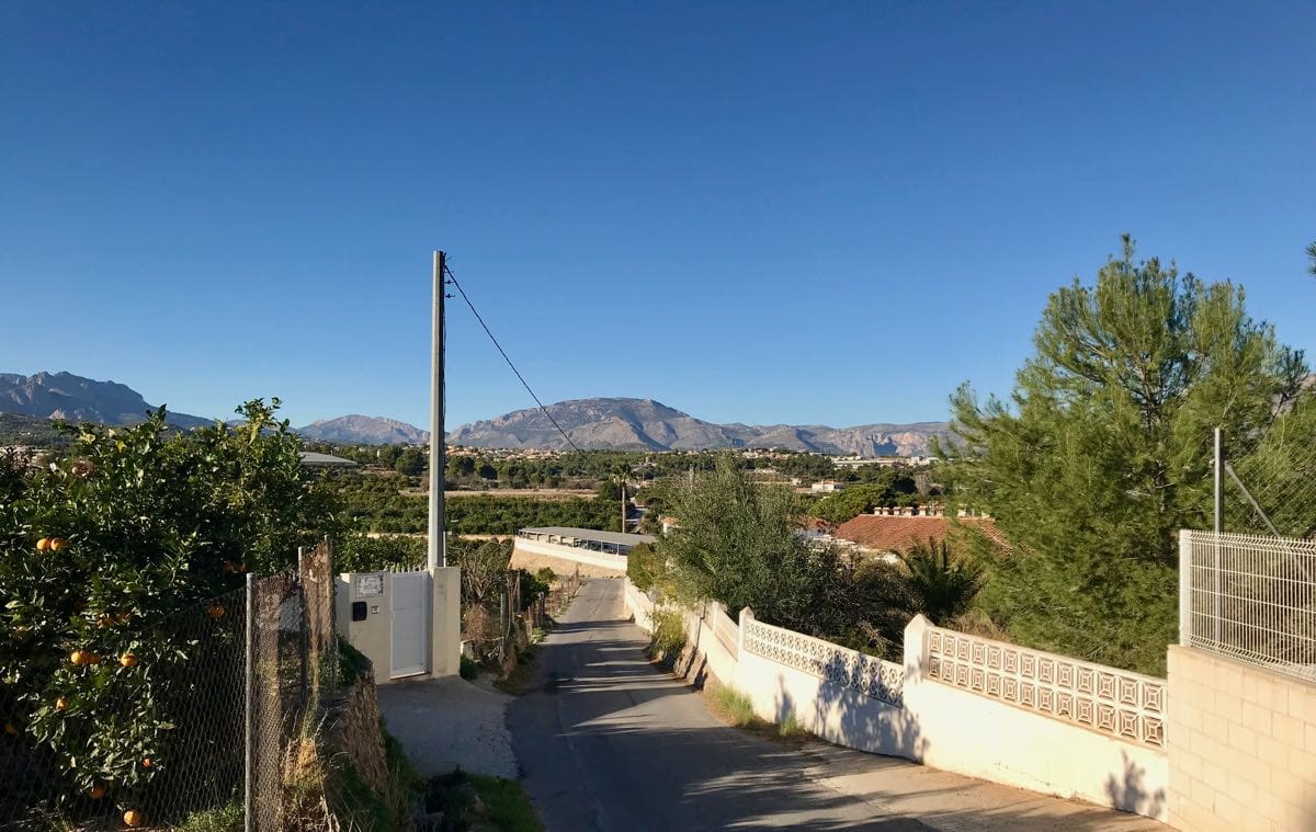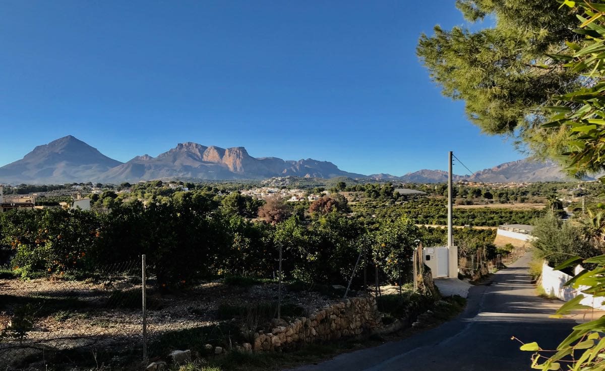 The lanes take us inland so the Aitana mountain range is in view as we walk. The atmosphere is so clear that they stand out in 3D set against the blue of the sky. We’re as far inland as this route takes us and begin the descent back down to the coast.