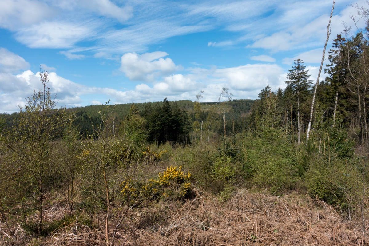 We follow one of the tracks that leads back to an old forestry trail then take a short break to catch our breath and enjoy the spring sunshine on the gorse.