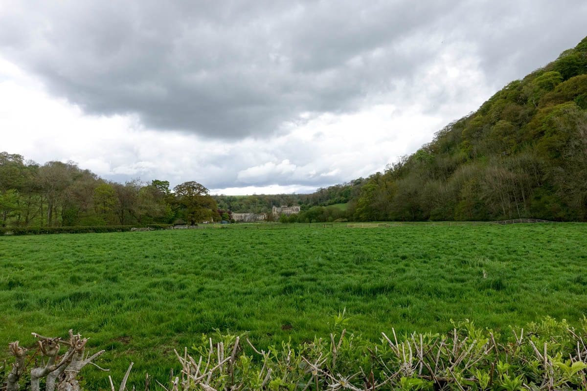 We’ve been descending for about 20 minutes and I’m beginning to think we can’t go down much further without meeting weird creatures from Middle Earth. If this had been tackled in the reverse direction this would be one hell of a test of stamina. The trail eventually levels and buts onto the tarmac road fabulously named Ingdale Howl. We turn left and follow this road until we come to the bridge over the River Rye. On the opposite bank on the downstream side of the bridge is a house with an amazing garden, well tended and with a stream running through it. Definitely worth a five minute stop. We turn right to walk parallel to the river with Rievaulx Abbey clearly in front of us. As we enter the car park we curse ourselves as we realise that we’re all members of English Heritage and to a man, we’ve left our membership cards in the car. There are toilets and a small cafe here should you need them.