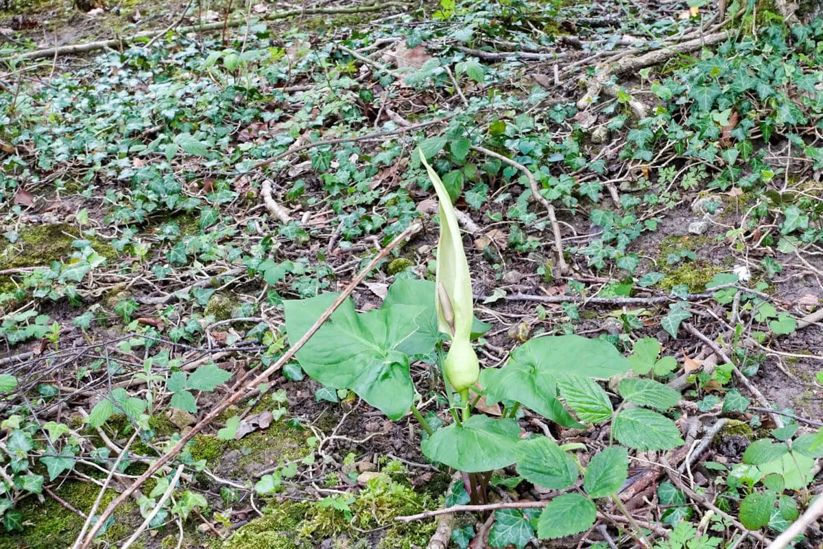 The trail resumes turning left off the road after the church and there begins a slow climb for about a mile when the trail meets the B1257. As we walk through a glade Tony calls out to look at some odd plants that I later discover to be arum maculatum or cuckoopint thanks to Pete Davies and Andrew Widdowson.