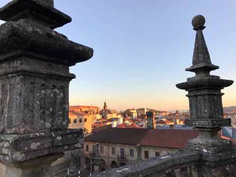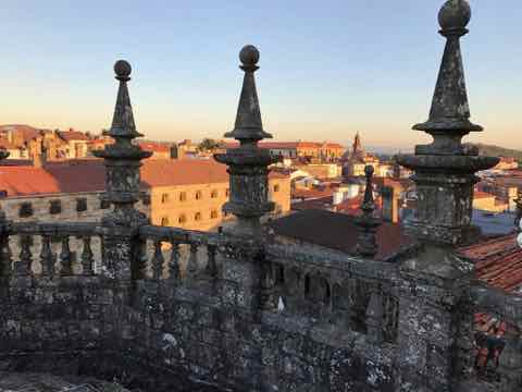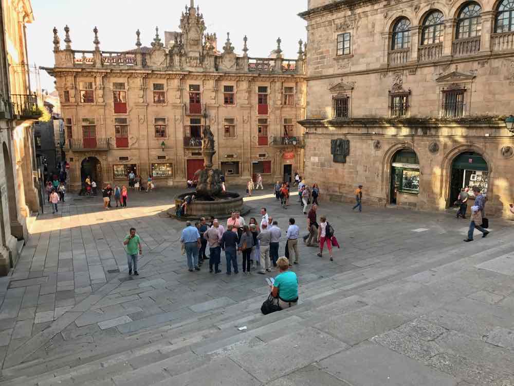 I pass numerous churches and wonderful old buildings. The town is on many levels so the vista includes pan tiled roofs in various shades of red. There are white and grey washed buildings with wrought iron around windows and balconies and below me there are ornate steps down to cellars under both houses and churches. they’re all decorated with images of saints, Spanish heraldic crests and the odd gargoyle.Before I know it I’m at the cathedral, well at least that’s where I think I am. After 10 thoroughly enjoyable minutes wandering around the cathedral square I venture in to be told this is the museum and I must turn left, then another left and then left again to the square and this is the location of the main entrance to the cathedral. In fairness I’m asked by numerous pilgrims at the end of their trek to take their picture with the “cathedral ” in the background. I do oblige but only after availing them of my new found knowledge I become an expert guide and by the time I access the square I have a whole caravan of pilgrims complete with walking sticks, back packs and numerous types of footwear from boots to sandals. About 80% of them are in tears. The emotions at the end of these various Camino walks from Spain, Portugal and France have been finely tuned especially over the final 24 hours and they just let it go! It sounds a little bit depressing but it’s not, in fact it’s joyous.I’m surplus to requirements now and duck out of the way by virtue of some steps. This action rids me of any guilt that may have accrued by fraudulently inferring that I’d just walked 800 kilometres. It would have been impossible to commit this deceit anyway; they looked like they’d just walked that distance whereas I looked like I’d just stepped off an aeroplane.