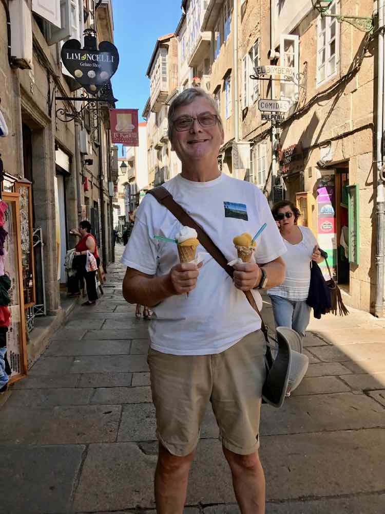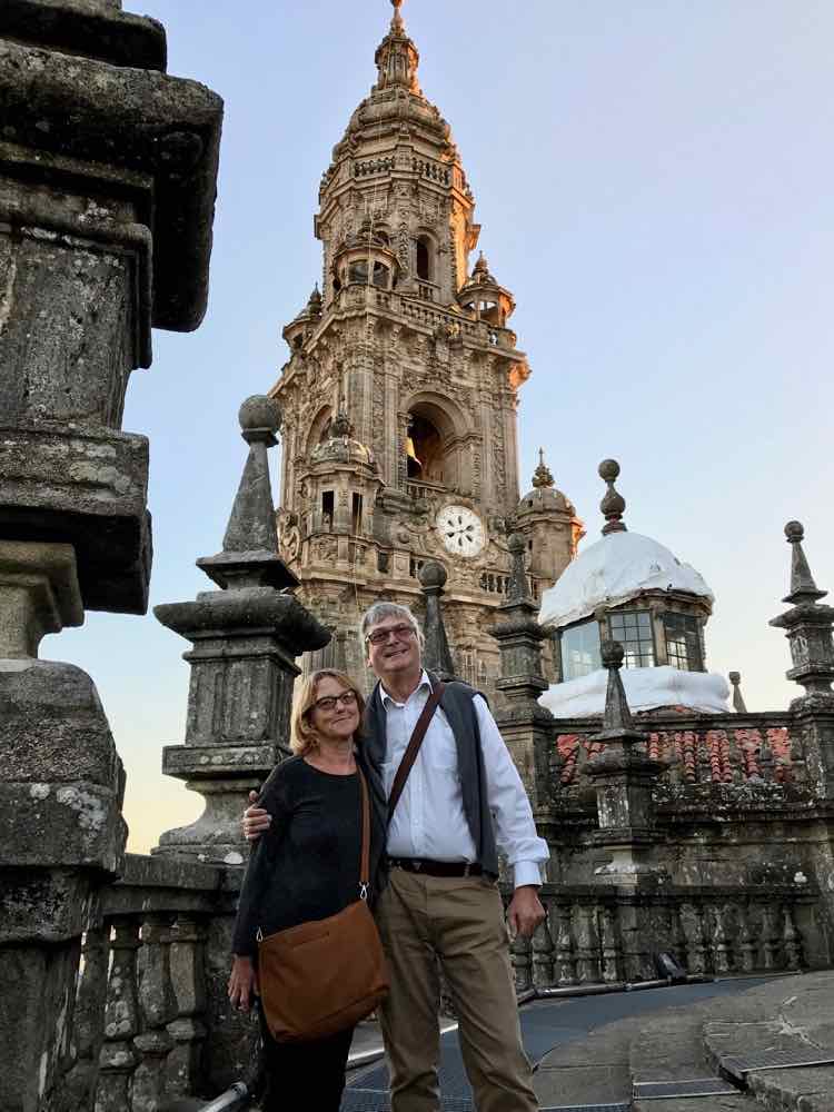 We take a walk around this beautiful place then make our way to a bar that’s well placed for ‘people watching’ and are beckoned in by a smiling Spaniard. A couple of beers later and the stress of the early morning drive from South London on the M25 followed by a two vehicle misunderstanding that stopped all of the anti-clockwise carriageways and the certain knowledge that Michael O’Leary’s aeroplanes most certainly wait for no-one are not even a memory.As we amble around the town and make our way back to the hotel I’m introduced to numerous peregrinos and the nicest thing of all is we meet them in a bar for a great meal tonight. One particular guy stands out as we share our stories. Otto had walked with the Pilgrim for a while but had only reestablished contact here in Santiago. I ask him his story and he frowns then laughs and tells me that’s his line. He lost his dear wife Maria to cancer about the same time as I lost my own dear wife Linda and we laugh and even end up a little moist eyed as we swap happy and joyful tales of our time together. I’m rather hoping that we stay in touch and time will tell.