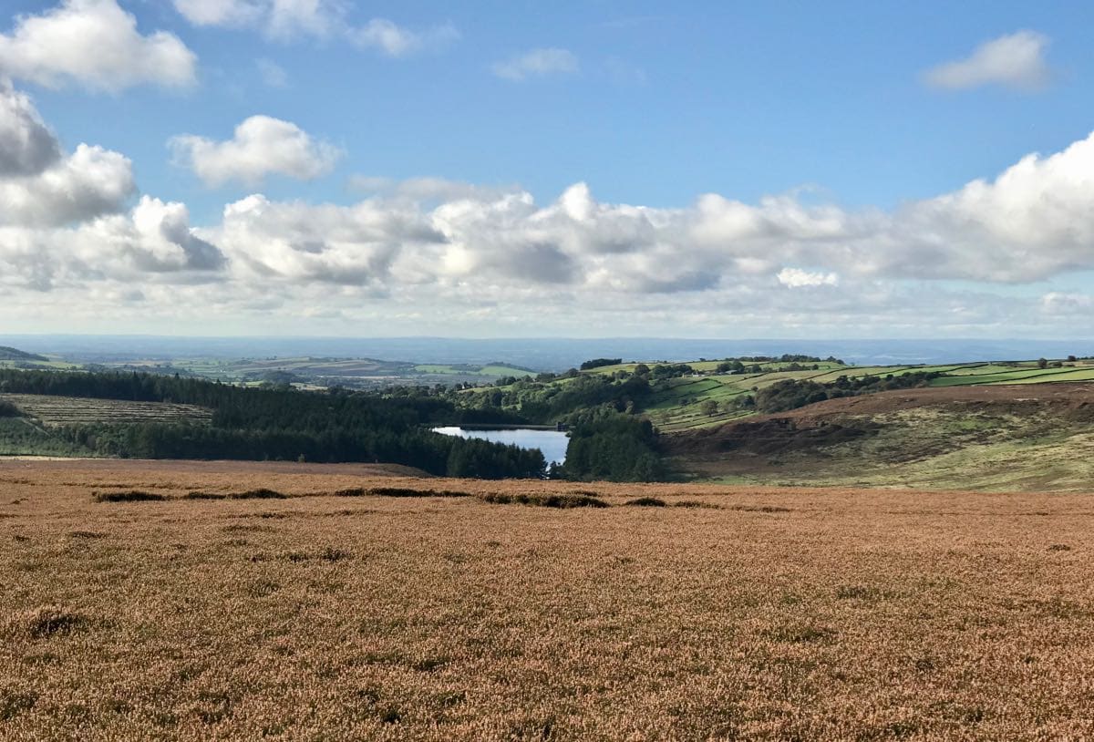 The track across the top of the moor is both wide and well kept by the lovely people who volunteer to maintain our national parks and we’re grateful to them. We’re walking into the sun but it’s nearly mid-day so it’s well up and the reservoir is bathed in bright light that reflects vivid blue off the sky.