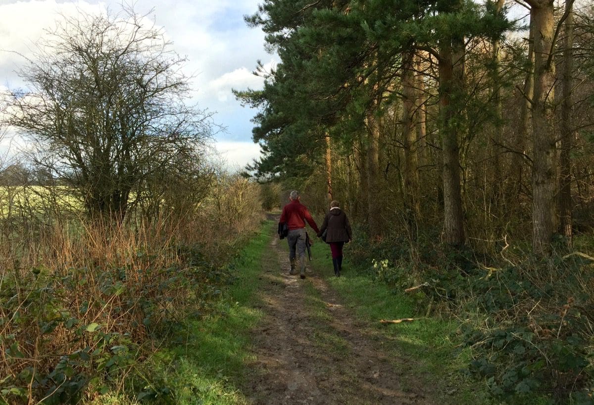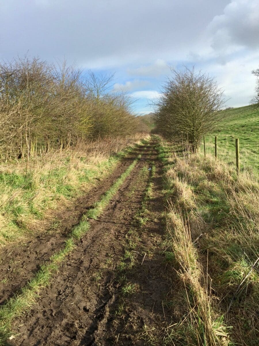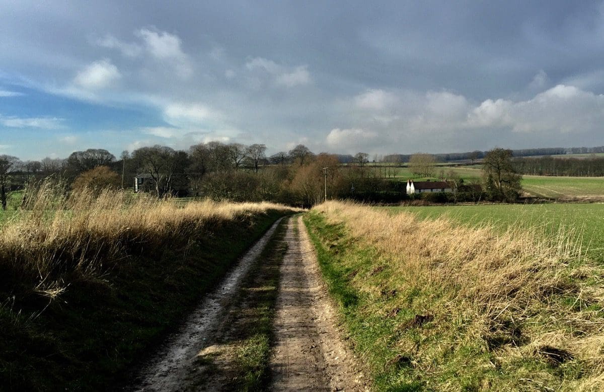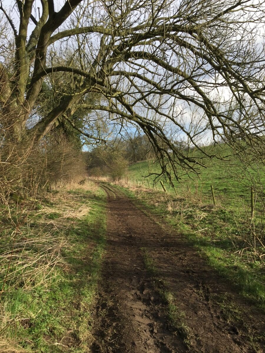 Initially, we walk down a gently sloping road with great views over the Wolds. A quick left and a right and we’re devoid of traffic but do have to suffer two crossbreed dogs who make the mistake of jumping up. Jayne rips the head off one and the other sees sense as we pass the owner who thinks that jumping up with muddy paws is cute!