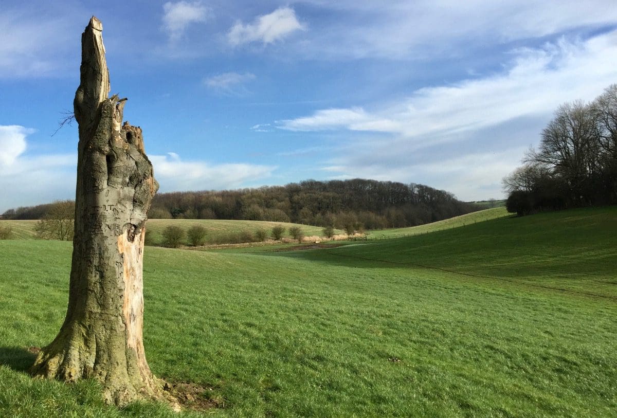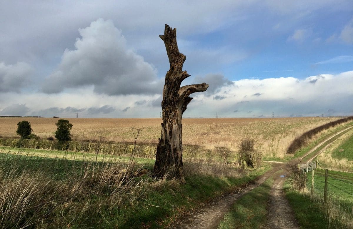 Apparently, we pass Wouldby Dam but that must be when I blink and before we know it we’re on a delightful little lane that’s dry and easy to negotiate. There are two interesting dead trees that look like they came second in a lightning strike. We then huddle into a ‘layby’ to allow a tractor and plough to go by. The traffic’s horrendous on the Wolds Way!