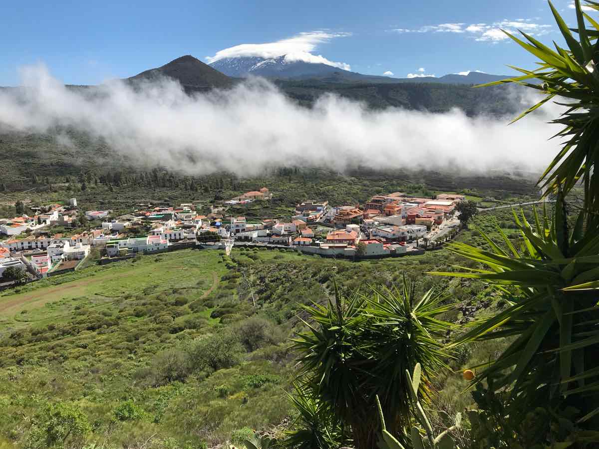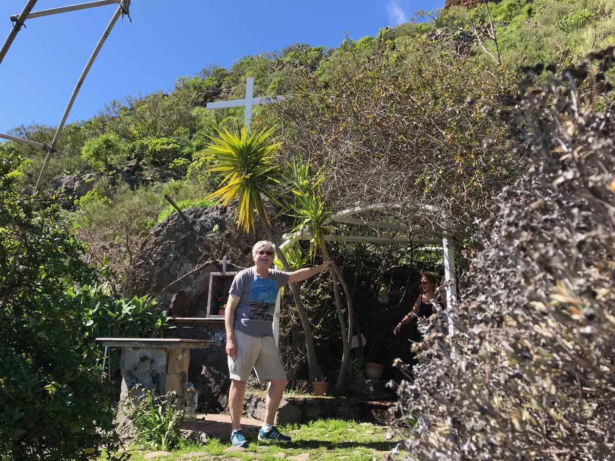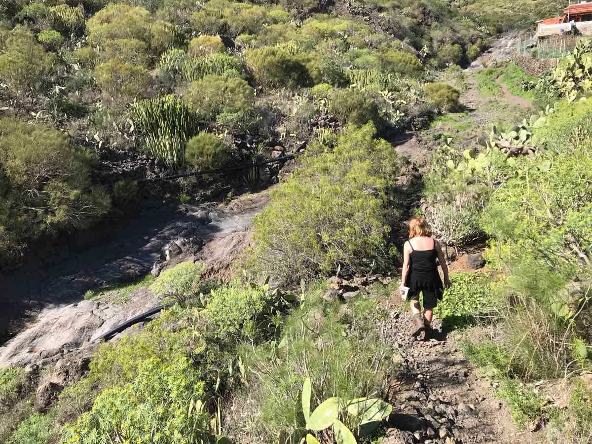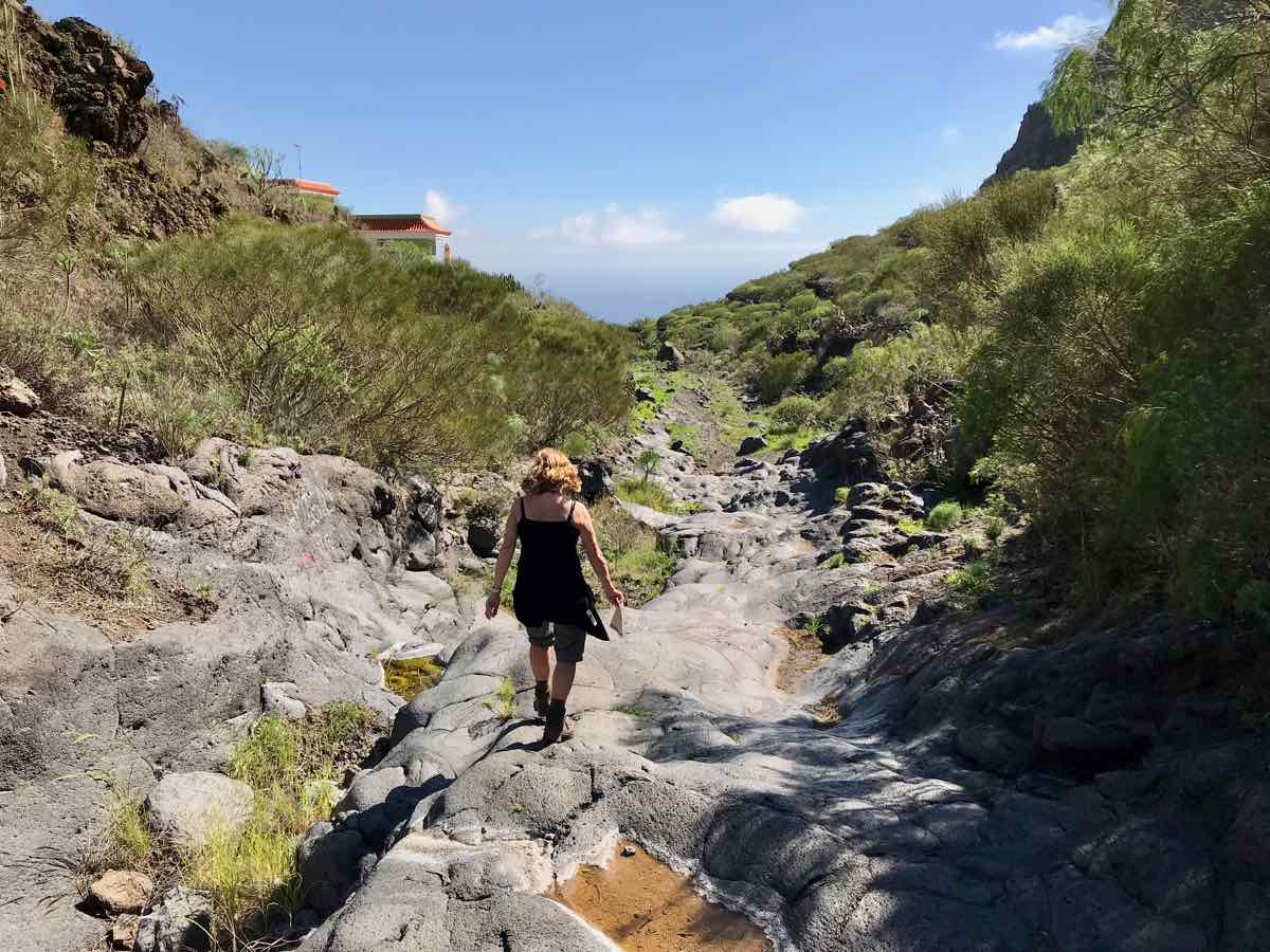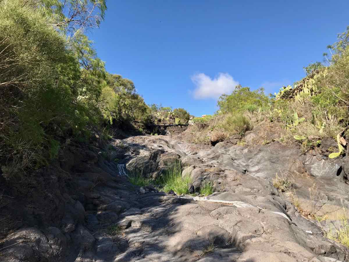 Santiago del Teide is a delightful little village at the base of Teide but at a height of about 2000 feet (900m). It’s got a lovely church and a few shops and more than its fair share of cafes. We chose one that’s on the side of the road with a few tables outside and one or two locals sitting at the tables inside. We order some coffee and a sticky bun and chose to sit in the morning sunshine to discuss what to do. I know that there’s a delightful but extremely short walk over a little bridge that goes over an arid river bed in the dry season and a raging torrent when there’s been some rain and, in fairness, we are in the middle of the Atlantic and only a couple of hundred miles from Africa so there can be some ‘interesting’ weather as witnessed by the boys only a couple of weeks ago.