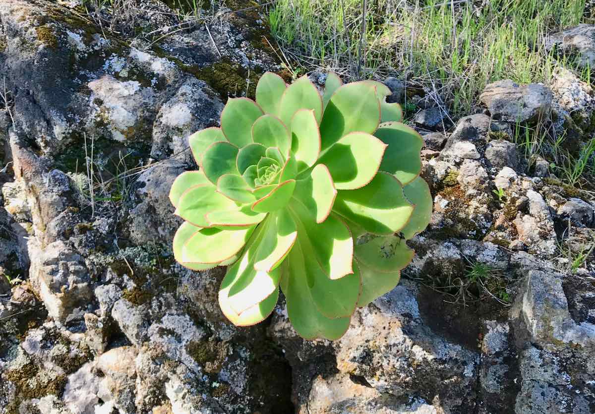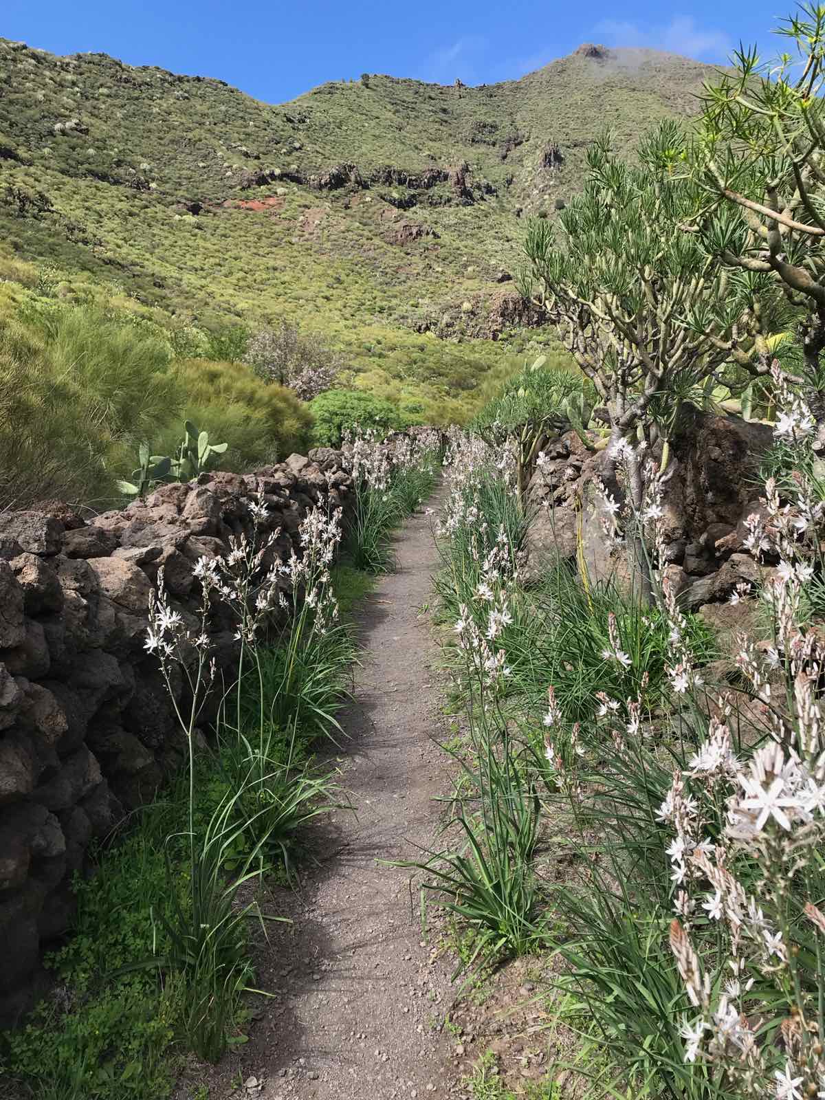 It’s sunny and warm and the beautiful, alpine spring flowers that delimit the way are glorious in their own right but when they’re framed with cactus, succulents and other exotic local flowers they take on even more beauty.