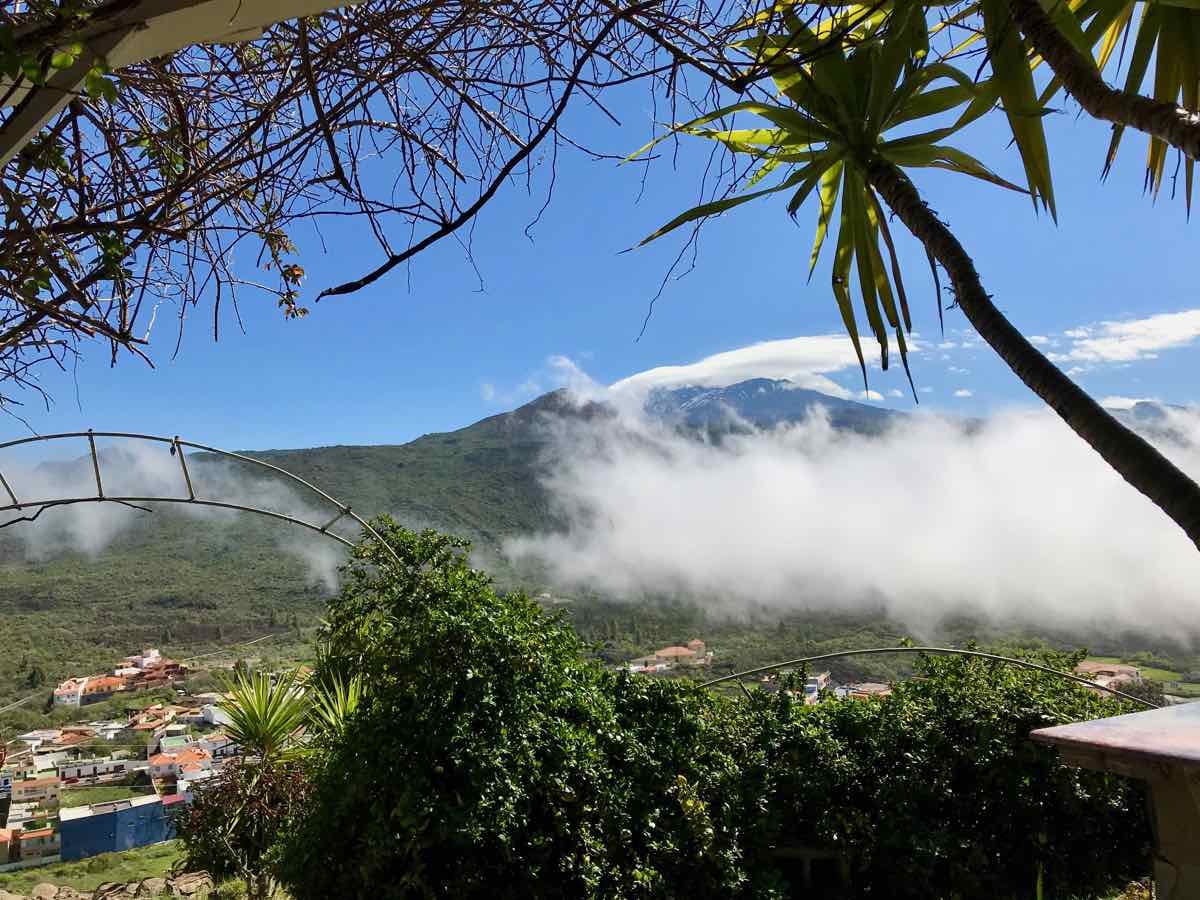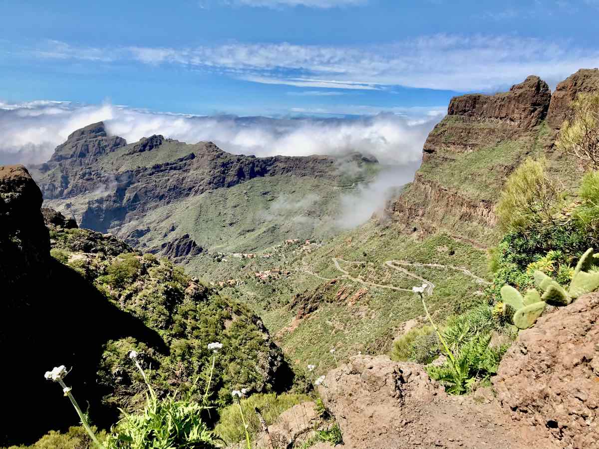 We get back to Santiago del Teide following a further stop afforded us by a couple pulling out and leaving a vacant space at the top of the pass that gave us the delightful sight of mist and cloud blowing over the mountain as we walk along the ridge. It looks sinister and beautiful in equal measure and as it blows over it reveals a fabulous vista of mountains and gorges to the North and wonderful a wonderful green valley far below to the South. This beautiful sight lasts for a few minutes before the mist and cloud obscure it and we return to the cold murk to remind us who is in charge but allowing occasional glimpses of what we’d seen just to remind us of what lies below.