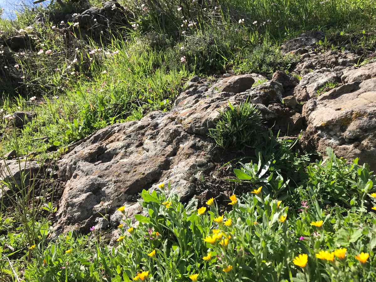 We move the car to a place very nearly opposite the garage, it’s free and leaves it accessible for when we return by bus. The track is like an old cart track with dry stone walls on either side. It follows the Barranco de Santiago (Ravine of Santiago) and is almost due south. The fields on either side are, or have been, cultivated and still contain vines, aloe vera and various citrus trees. They’re a little unkempt now but appear to have some possibilities if an enthusiast wanted to bring them back to life. There are flowers either side, the yellow ones stand out and with a little bit of concentration I can just about make out the red ones although my colour blindness impedes the immediate recognition that other colours stimulate. There are also some vivid blue forget-me-knots that bring memories of childhood and springtime to mind. All this together with the sun makes an idyllic start to the walk.