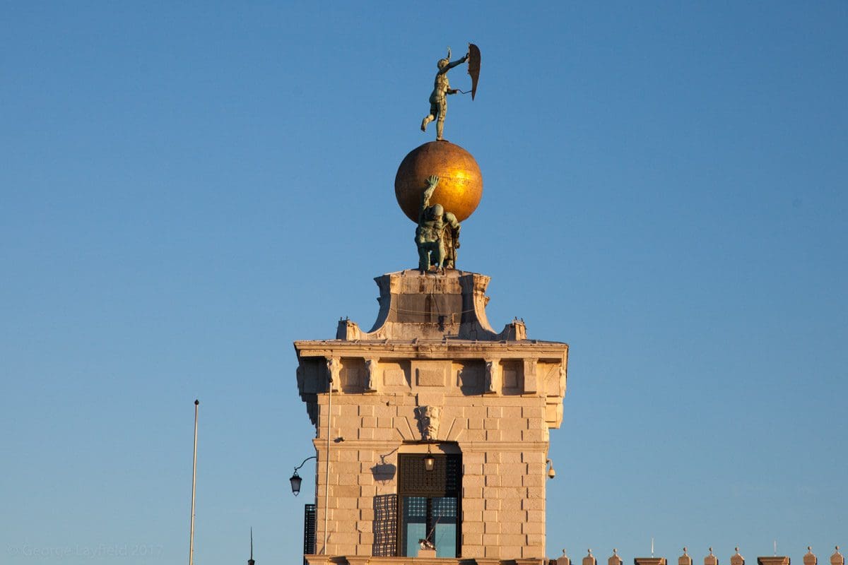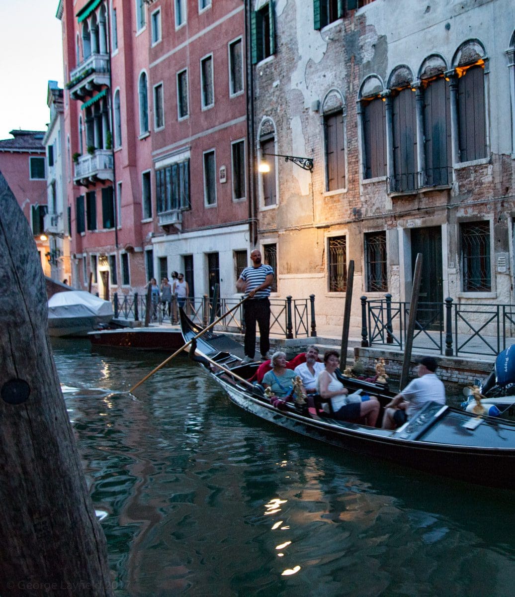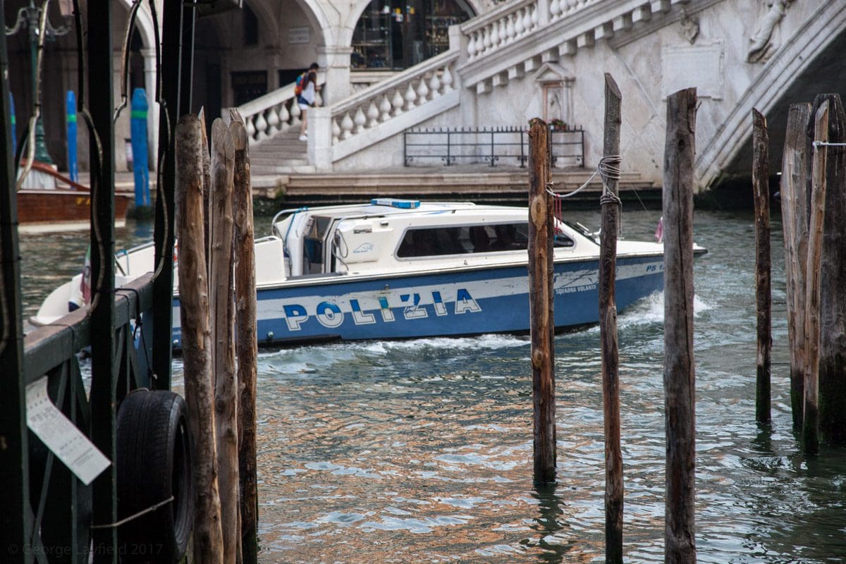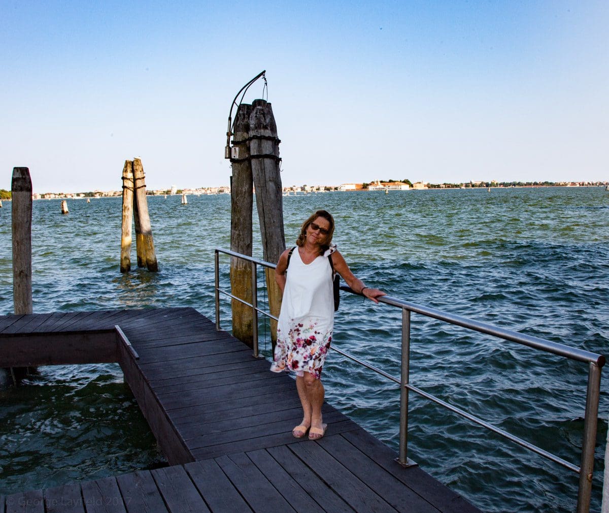 The other two nights are spent with best bib and tucker on the banks of the Grande Canal. The prices are somewhat challenging but the ambience can not be bought and the Pilgrim is looking stunning so it has to be done. We eat as the sun goes down and the tide comes in. The canal laps on to the piazza as the vaparettos and other boats go by but the tiny waves only encroach by a couple of yards and we’re another twenty yards away. There are youngsters all dressed up and some of them wearing wreathes around their necks to celebrate graduation. They’ve had a few drinks but are not intrusive and they seem to want to do is sing. A police boat goes by with blue lights flashing but the picture is surreal as it doesn’t seem to be in any hurry.