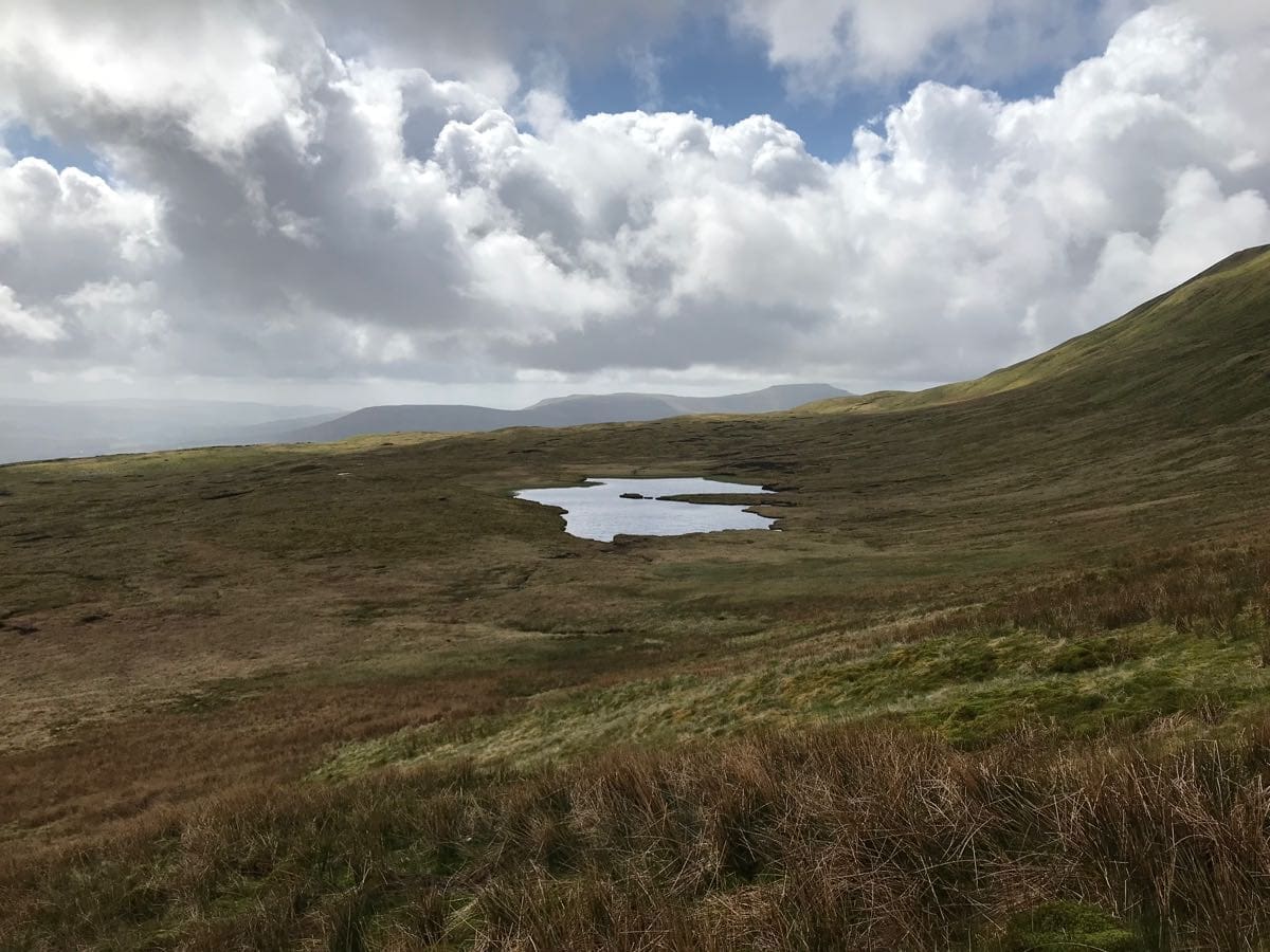 The path abruptly turns from steps to track over a style and we’re on fairly open moor although there are fields beyond the drystone wall to our right and bracken, rocks and the odd tarn with the other peaks in the distance to our left.